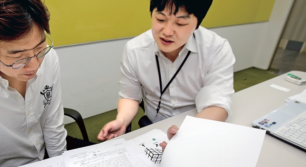 ‘레이니스트’ 사무실에서 동료와 논의하고 있는 김태훈 대표. 그는 가장 힘든 것은 사람을 잃는 일, 가장 기쁜 일은 사람을 얻는 일이라고 했다.