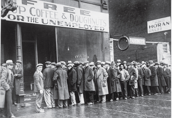 1931년 미국 대공황 시기 시카고의 한 식당 앞에서 무료로 주는 수프를 먹으려 줄을 서 기다리고 있는 실업자들의 모습. 위키피디아