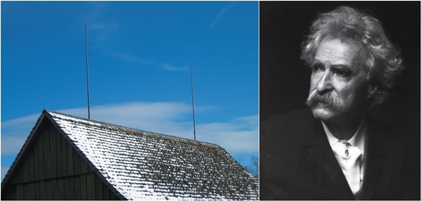 벤저민 프랭클린이 발명한 피뢰침(왼쪽). 마크 트웨인은 단편소설 ‘정치경제학’을 써서 어리석은 경제학자를 조롱했다. 위키피디아