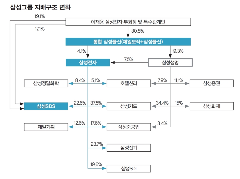 이재용 삼성전자 부회장 등 삼남매가 지분 19.1%를 보유한 삼성SDS는 본경기를 뛸 ‘핵심 선수’다. 통합 삼성물산이 삼성SDS 지분 17.1%를 갖고 있어, 두 회사 간 합병도 점쳐진다. “삼성전자에 대한 지배력을 강화할 목적에서 삼성전자를 지주회사와 사업회사로 인적분할한 뒤에 지주회사와 삼성SDS를 합병할 것으로 예상된다.”(KDB대우증권 7월20일 보고서) 이 합병안은 두 마리 토끼를 동시에 잡는 방식이다. 총수 일가의 그룹 전체에 대한 지배력을 높이는 한편, 삼성전자 사업부문을 떼냄으로써 삼성전자 주주들이 삼성SDS와의 합병을 반대하는 저항감을 희석시킬 수 있어서다. 전자 계열사를 묶는 사업 개편 방식의 하나로, 삼성전자와 삼성SDI의 합병설도 나온다.