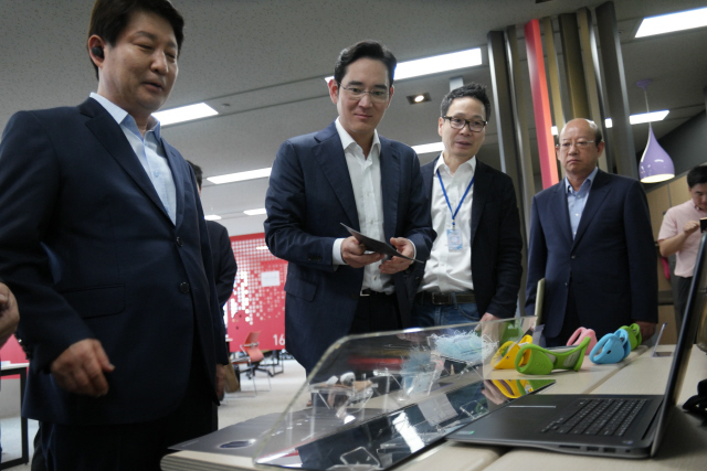이재용 삼성전자 부회장이 지난 7월21일 대구창조경제혁신센터를 방문해 권영진 대구시장(왼쪽)과 함께 벤처기업 운영 현황을 살펴보고 있다. 삼성전자 제공