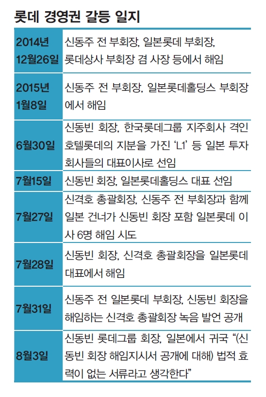 신격호 회장과 신동주 전 회장은 7월27일 일본으로 건너가서 신동빈 회장 등 임원 6명을 일본롯데홀딩스 이사에서 해임했다. 신격호 회장의 동생 등 일부 친족들도 신동주 전 부회장 편을 들었다. 하지만 7월28일 신동빈 회장 쪽은 정식 이사회를 열어 아버지가 내린 해임 결정을 인정하지 않는 대신 신격호 회장을 명예회장으로 추대해 경영권에서 배제하기로 결정했다.