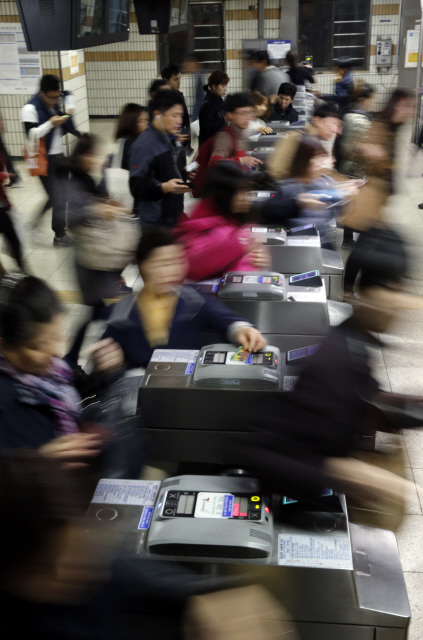 서울 구로디지털단지역 퇴근길에 분주한 사람들. 정용일 기자