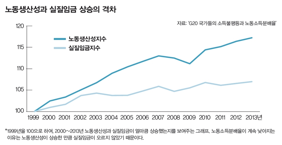 당연한 일이지만, 그 함의는 적지 않다. 소득불평등도를 줄이고자 한다면, 재분배만으로 충분하지 않고 노동시장에서 이뤄지는 일차적 분배를 바로잡아야 한다는 것이다. 즉, 노동소득분배율 개선이 주요한 선결 과제가 된다. 그런데 노동소득분배율이란 기본적으로 임금과 노동생산성의 관계에 의해 결정된다. 노동생산성 상승에 맞춰 임금이 비례적으로 올라가면, 노동소득분배율은 일반적으로 변화하지 않는다. 그간 노동소득분배율이 하락한 것은 임금이 노동생산성 격차를 따라잡지 못해서 생긴 일이다. 따라서 이 격차를 줄이는 것이 중요한 정책 과제가 된다. 노동시장이 제대로 작동하지 않아서 노동-자본 간 분배가 비틀어지면 이를 교정하는 일은 재분배 정책에 고스란히 넘어간다. 마땅히 재분배가 있어야 하겠지만, 노동시장이 해야 할 일까지 떠맡으면 재분배 부담이 커지고 효율성도 떨어진다.
