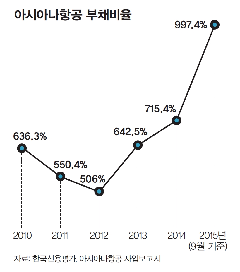 휴대전화 너머 신 위원장의 목소리에선 분통이 느껴졌다. “회사가 현재 위기라고 하면서도 아시아나항공의 재무구조를 악화시킨 근본적 이유인 2006년 대우건설 인수와 대한통운 인수에 대해 (경영진은) 말하지 않는다. 이전에는 부채비율(부채/자본금)이 200% 정도로 건실한 기업이었는데 2006년 이후 600%로 뛰었다. 지금 위기는 잘못된 인수 경영에 있었다. 그 부분이 중요하다.” 이날 오후 박삼구 금호아시아나그룹 회장은 금호산업 채권단에 경영권(지분율 50%+1주) 인수대금 7228억원을 완납했다. 금호산업은 아시아나항공 지분 30.08%를 보유한 사실상 모회사다. 금호아시아나그룹은 빚으로 대우건설 인수에 성공해 몸집을 키웠다. 그러나 이후 닥친 세계적인 불경기는 그룹에 유동성 위기를 불러왔다. 박삼구 회장은 2009년 12월 그룹의 지주회사 격인 금호산업의 경영권을 채권단에 넘겼다. 산업은행 등 채권단은 박삼구 회장이 자신의 재산을 출연한다는 조건을 달아 계열사인 아시아나항공 등의 경영권을 유지하게 해줬다. 산업은행 출신인 이성근 전 산은캐피탈 사장, 정건용 전 산업은행 총재는 현재 아시아나항공의 사외이사이며, 정영의 전 산업은행 총재는 아시아나항공 고문을 맡고 있다. 박삼구 회장은 6년 만인 2015년 다시 금호산업의 경영권을 되찾았다. 박삼구 회장의 복귀를 전후해 아시아나항공의 구조조정안이 흘러나왔다. 아시아나항공은 이를 확정해 12월30일 경영 정상화 방안을 발표했다. △국내·국외 지점 151곳을 106곳으로 축소 △예약·발권 부서와 국내 공항서비스 등 아웃소싱 △희망휴직 및 희망퇴직 운영 △임원 연봉 반납 △2017년 프리미엄이코노미석 도입 △발리 등 일부 노선 중단 등이다. 아시아나항공은 없어지는 부서 직원들은 “재배치를 통해 고용 안정을 유지한다는 계획”이라고 밝혔다. 사실 아시아나항공의 상황은 녹록지 않다. 2015년 아시아나항공의 영업이익은 9월까지 172억원을 기록했다. 금융비용 등을 빼면 1634억원 순손실이 났다. 2015년 상반기에 발생한 중동호흡기증후군(메르스)은 중국 관광객을 줄이는 등 영업에 타격을 줬다. 매출 비중이 높은 일본·중국·동남아 노선에는 저가항공사들이 치고 들어왔다. 아시아나항공의 2013년 영업이익은 615억원 적자, 2014년에는 422억원 흑자였다. 항공기 84대를 가진 매출 5조원대의 기업으로서는 부진한 실적이 계속됐다. 계열사 지원에 현금 쓰고 투자는 밀려 한국신용평가는 2015년 12월18일 아시아나항공의 신용등급을 BBB+에서 BBB로 한 단계 낮췄다. 한국신용평가는 “(A380) 항공기 투자로 재무 부담이 과중한 수준이고, 저가항공사와의 경쟁이 심화돼 수익성 개선이 어렵다”고 평가했다. 아시아나항공의 부채비율은 997.4%(2015년 9월 기준)에 이른다. 부채비율이 높으면 회사가 돈을 벌어도 이자로 내는 비용이 많아 부담이 커진다. 아시아나항공 홍보팀 관계자는 경영 정상화 방안에 대해 “국내 저비용항공사의 약진, 외국 항공사의 좌석 공급 확대로 인해 경쟁이 심화됐다. 전세계적으로 항공사들이 겪는 구조적인 문제다. 경쟁이 격화된 상황에서 부채비율이 높으니 회사로서는 체중을 줄일 수밖에 없다”고 설명한다. 그러나 아시아나항공 위기의 본질은 과거로 더 거슬러 올라가야 한다. 대우건설 인수로 시작된 2009년 금호아시아나그룹의 유동성 위기는 그룹 전체 계열사에 부담을 줬다. 당시 부도 위기에 직면한 금호산업의 기업어음을 아시아나항공은 2009년 12월 790억원어치나 사서 현금을 지원했다. 금호산업은 박삼구 회장이 그룹 경영권을 지배하는 데 핵심적인 회사였다. 결국 금호산업은 채권단 관리에 넘어갔다. 아시아나항공이 산 기업어음 790억원어치는 출자전환됐다. 금호산업으로부터 받아야 할 이자도 감면됐다. 경제개혁연대는 “2013년에도 아시아나항공이 금호산업에 대해서만 96억원의 상표권 사용료를 지급해, 상표권 사용료를 가장한 계열사 부당 지원이 아닌지 의혹을 제기하지 않을 수 없다”고 했다. 아시아나항공으로서는 자신의 성장동력으로 써야 할 돈이 사라진 셈이다. 아시아나항공이 보유한 84대의 항공기도 그 기종이 다양해 정비·서비스 효율이 떨어진다는 평가를 받는다. 프리미엄급 항공사로 가기도, 저가항공사와 경쟁하기도 애매한 상황에서 투자가 필요했다. 경제개혁연대의 채이배 회계사는 “아시아나항공이 자신의 상황이 좋지 않음에도 (재벌 총수가 소유한) 금호산업을 지원하기 위해 자금을 사용했다. 이 때문에 얼마나 부채가 늘었는지는 확인할 수 없지만 사용된 자금으로 인해 성장 가능성을 갉아먹는 결과를 초래할 수 있다”고 설명했다. 한국신용평가의 김용건 파트장도 “항공사들은 비행기 도입 때문에 부채비율이 대체로 높은 편이다. (하지만) 기업은 이익이 나면 자본 확충을 하고 투자를 늘리는 선순환적인 경영을 해야 한다. 아시아나항공의 현재 상황은 그룹의 영향을 받은 것이 분명하다”고 지적했다. 다시 빚지고 돌아온 최고 경영진 아시아나항공 직원들은 술렁이고 있다. 박삼구 회장이 금호산업을 되찾아오면서 들인 인수대금 7228억원 가운데 5700억원가량은 은행 대