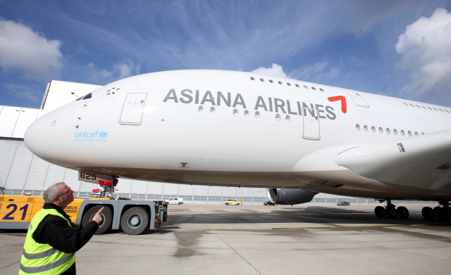 아시아나항공 A380 1호기가 2014년 3월26일 독일 함부르크 에어버스 도색공장에서 도색을 완료하고 격납고를 빠져나오고 있다. 아시아나항공은 재무 부담에도 불구하고 A380 4기를 도입했다. 사진공동취재단