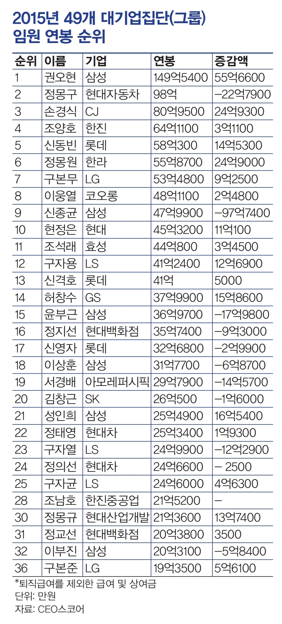 권오현 삼성전자 부회장이 지난해 149억5400만원을 받아 한국 상장회사 임직원 가운데 가장 많은 연봉을 받은 이로 확인됐다. 정몽구 현대자동차그룹 회장은 현대차로부터 56억원 등 모두 98억원을 받아 재벌 총수 가운데 연봉이 제일 많았다. 손경식 CJ그룹 회장은 80억원, 신동빈 롯데그룹 회장은 58억원을 받았다고 공시했다. LG그룹 구본무 회장은 53억원을 받았다. 삼성그룹의 이재용 삼성전자 부회장과 이서현 삼성물산 패션부문 사장은 등기임원이 아니어서 공개 대상에서 빠졌다.