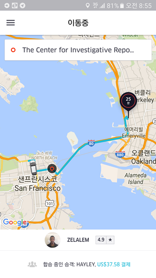 차는 샌프란시스코의 유명한 고갯길을 따라 올랐다. 샌프란시스코 도로는 경사가 만만치 않아 이 고갯길을 넘는 교통수단으로 전차가 오래전에 도입됐고, 지금은 관광용으로 많이 쓰인다. 차는 고갯길을 넘어 목적지인 디비사데로 거리의 한 주택 앞에 20분 만에 섰다. 하페드에게 고맙다는 말만 하고 내렸다. 곧 스마트폰으로 문자메시지가 왔다. 16.4달러. 우버에 등록된 신용카드로 이용료가 자동으로 지급됐다. 미국에선 택시 탈 때도 줘야 한다는 팁을 챙겨줄 필요 없이 그냥 내리면 된다.