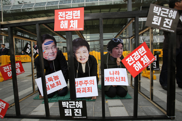 11월18일 서울 영등포구 여의도 전국경제인연합회 회관 앞에서 전국사무금융서비스노동조합 조합원들이 박근혜 대통령 퇴진과 전경련 해체를 요구하는 퍼포먼스를 하고 있다. 류우종 기자