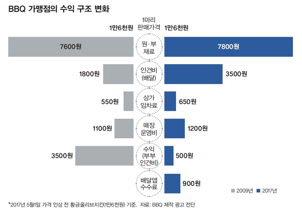 BBQ가 고집을 꺾지 않은 이유는 뭘까. 관계자는 “경영상 어려움에 부닥친 가맹점주들의 요구가 많았다”며 “이번 인상으로 본사가 취하는 이득은 전혀 없다”고 말했다. 2009년 이후 8년간 가격이 동결되는 동안 인건비와 임차료는 상승하고 배달앱(애플리케이션) 수수료 등 신규 비용이 발생해 가맹점주들이 생존 위기에 내몰렸다는 설명이었다. 틀린 말은 아니다. 일부 가맹점주들 사이에선 4~5년 전부터 마진 하락을 이유로 가격을 올려야 한다는 요구가 꾸준히 나왔고, 이 내용은 최근 가맹점운영위원회 대표와 본사 협의로 최종 확정됐다.