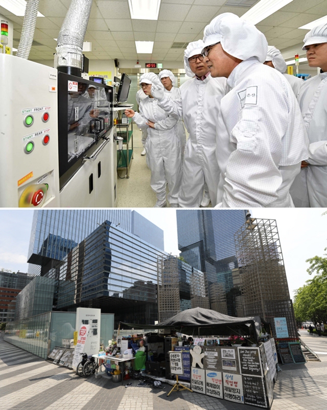 지난 5월31일 삼성직업병가족대책위원회(가대위)가 충남 아산시 삼성전자 온양 사업장을 방문해 안전환경을 살펴봤다(위쪽). 삼성전자 반도체 사업장에서 얻은 직업병에 대해 가대위는 삼성전자와 협의해 보상을 받았으나, 또 다른 피해자 단체인 ‘반올림’은 피해자 배제 없는 보상 등을 요구하며 농성 중이다(아래쪽). 삼성전자 제공, 류우종 기자