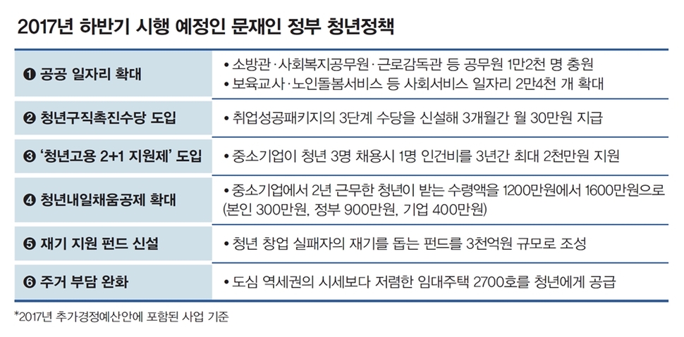 ‘청년을 위한 추경안’이 국회에서 통과되면 청년의 삶은 좀 나아질까. 이번 추경안에는 청년 관련 정책이 다양하게 담겼다(상단 표 참조). 하반기에 청년이 선호하거나 많이 찾는 공무원과 사회서비스 일자리를 3만6천 개 늘리고, 청년 채용 중소기업에 재정 지원을 확대하겠다는 것이 정책의 뼈대다.