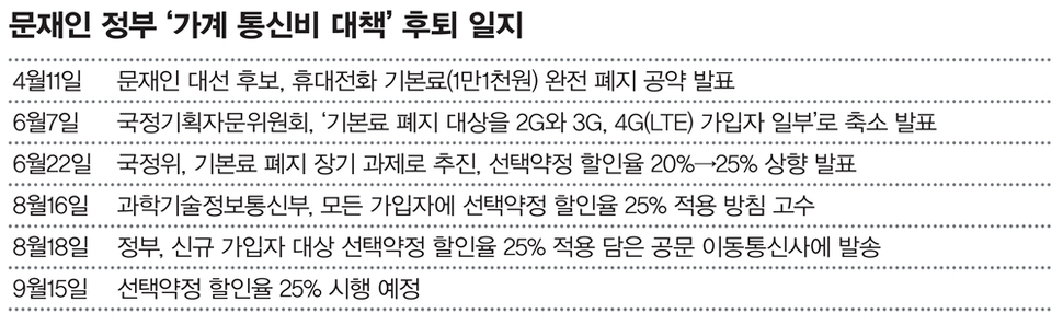 선택약정 할인율의 적용 범위는 문재인 정부의 가계 통신비 인하 의지를 가늠하는 마지막 시험대로 불렸다. 문재인 정부 들어 가계 통신비 공약이 지속적으로 후퇴해왔기 때문이다. 대선 당시 문 대통령은 “한 가구에서 한 달에 12만4500원, 1년이면 150만원을 이통통신 요금으로 지출하는데 이통통신 3사는 지난해에만 3조6천억원의 영업이익을 올렸다”며 ‘월 1만1천원 이통통신 기본료 폐지’ 공약을 전면에 내걸었다. 2G 기본료, 3G 표준요금제, 4G(LTE) 정액요금제 속에 숨어 있는 기본료를 다 없애 모든 소비자가 고루 통신비 인하 효과를 보게 하겠다는 취지였다.