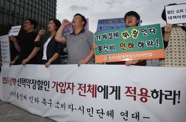녹색소비자연대·참여연대를 비롯한 6개 시민단체가 8월16일 서울 광화문광장에서 “선택약정 할인율 25% 혜택을 기존 가입자에게도 적용하라”고 촉구하고 있다. 연합뉴스