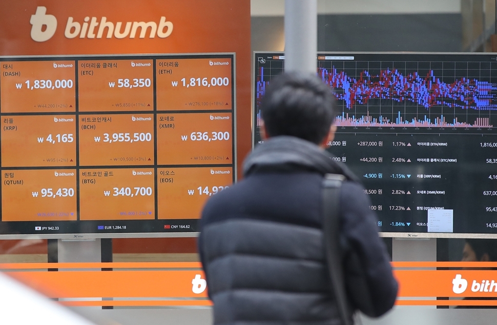 정부가 ‘가상화폐거래소 폐지 검토’라는 초강수 대책을 밝히며 연일 으름장을 놓고 있지만 가상화폐 열풍은 좀처럼 식지 않는다. 1월8일 국내 최대 가상화폐거래소인 빗썸 앞을 한 시민이 지나가고 있다. 연합뉴스