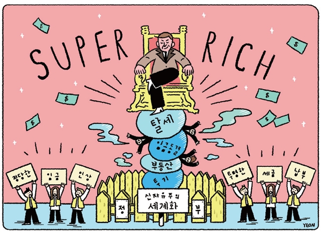 이렇게 엄청난 돈을 가진 부자를 ‘슈퍼리치’라고 해. 이들은 과연 누구일까? 1위는 마이크로소프트의 빌 게이츠야. 750억달러(약 88조2천억원)를 가지고 있어. 다음으로 패션 브랜드 ‘자라’의 회장 아만시오 오르테가(670억달러), 버크셔 해서웨이라는 회사의 최대주주 워런 버핏(608억달러), 멕시코 통신 재벌인 카를로스 슬림 엘루(500억달러), 아마존 회장 제프 베이조스(452억달러), 페이스북을 만든 마크 저커버그(446억달러), 오라클 창업자 래리 엘리슨(436억달러), 통신사 <블룸버그>를 만든 마이클 블룸버그(400억달러)가 뒤를 잇고 있어. 이 부자들은 아무리 좋은 집을 사고, 고급 음식을 먹고, 비싼 옷을 사도 죽을 때까지 자기 돈을 다 쓰지 못할 거야. 물론 어려운 사람에게 나눠주거나 학교·도서관 같은 공공시설을 많이 짓는 일을 한다면 다 쓸 수 있을지도 모르겠지만.