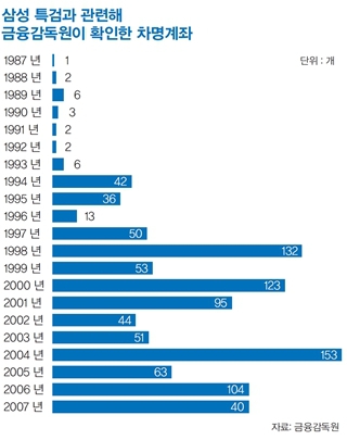 하지만 금감원 조사 결과, 삼성 특검이 찾아낸 이건희 회장의 차명계좌 대다수는 금융실명제가 실시된 1993년 8월 이후에 만들어진 것으로 드러났다. 이병철 선대 회장이 1987년 타계했음을 고려하면 차명계좌의 돈이 상속재산이라는 해명은 쉽게 납득이 안 된다. 차명계좌는 2004년 153개가 만들어져 가장 많고, 특검 수사 착수 1년 전인 2006년에도 무려 104개나 새로 개설됐다. 이는 이 회장의 차명계좌에 있는 돈이 회삿돈을 빼돌린 비자금일 가능성에 더 무게를 두게 한다.