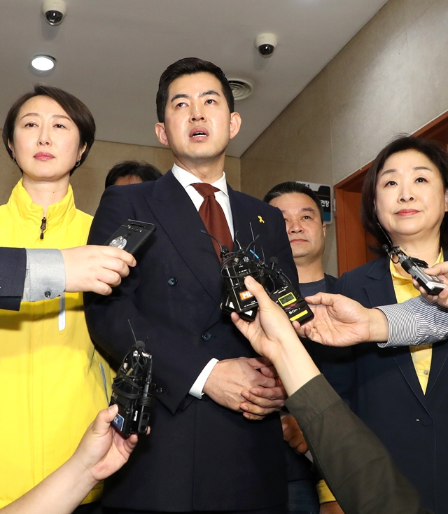 조현아 사장의 ‘땅콩 회항’ 사건 피해자인 박창진 전 대한항공 사무장(가운데)이 4월17일 국회에서 기자회견을 하고 있다. 연합뉴스