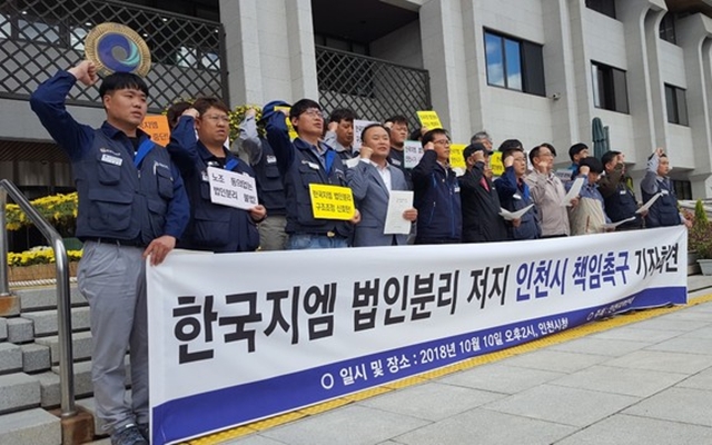 한국지엠(GM) 노조를 비롯한 금속노조 인천지부 노동자들이 10월10일 인천시청 앞에서 한국지엠의 법인 분할 방안에 반대하는 기자회견을 열었다. 한겨레