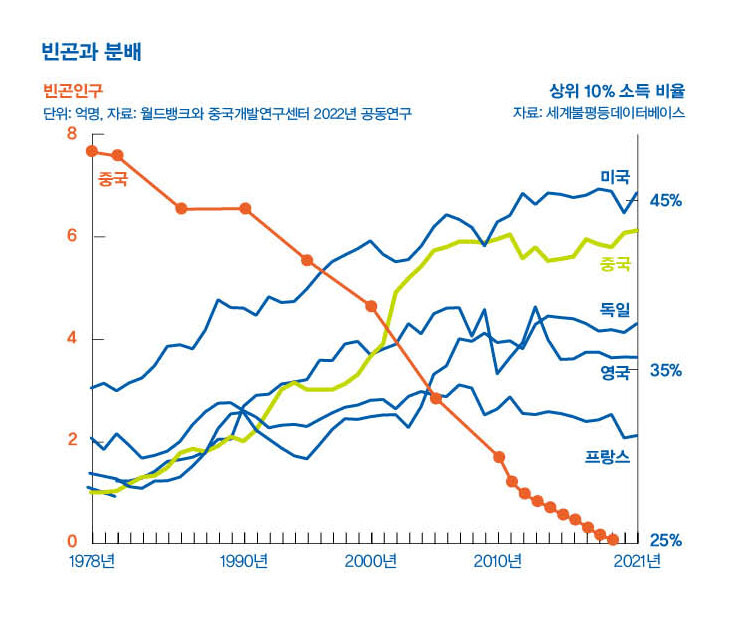 (표 참조) 하지만 빛이 있으면 그림자도 있는 법, 이 과정에서 분배는 심각하게 왜곡됐다. 1978년 중국의 상위 10%의 소득 점유율은 27.8%로 서구 국가들에 비해 가장 낮은 편이었으나, 2021년에는 43.4%로 미국에 약간 뒤질 뿐 유럽 국가들보다 훨씬 높아졌다. 지역적으로도 도시와 농촌의 격차가 확대됐고, 대도시는 농촌에서 이주한 노동자가 대규모로 하층민을 형성하면서 사회적 통합을 이루지 못했다.