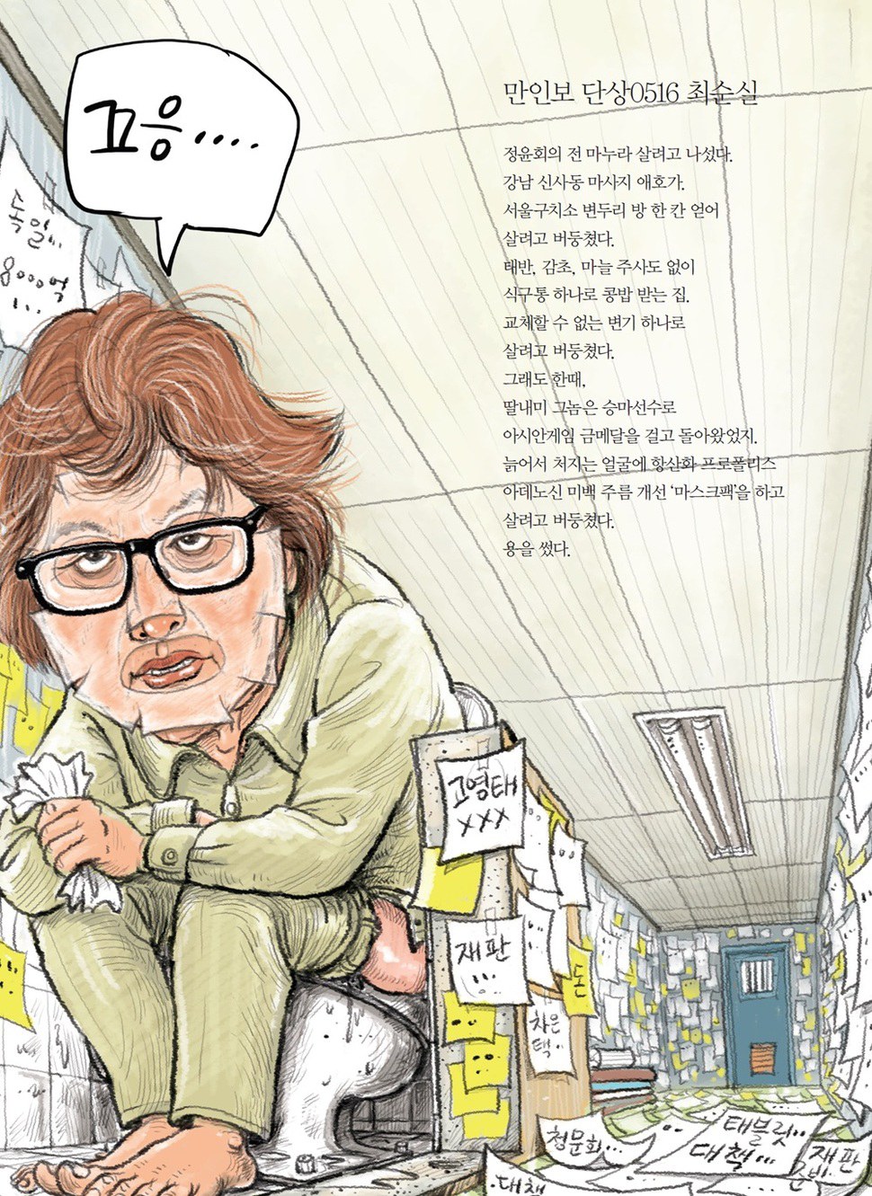 페이스북 0트위터 0공유네이버블로그카카오스토리카카오톡 공유하기스크랩프린트크게 작게※이미지를 누르면 더 크게 보실 수 있습니다. 만인보 단상0516 최순실 정윤회의 전 마누라 살려고 나섰다. 강남 신사동 마사지 애호가. 서울구치소 변두리 방 한 칸 얻어 살려고 버둥쳤다. 태반, 감초, 마늘 주사도 없이 식구통 하나로 콩밥 받는 집. 교체할 수 없는 변기 하나로 살려고 버둥쳤다. 그래도 한때, 딸내미 그놈은 승마선수로 아시안게임 금메달을 걸고 돌아왔었지. 늙어서 처지는 얼굴에 항산화 프로폴리스 아데노신 미백 주름 개선 ‘마스크팩’을 하고 살려고 버둥쳤다. 용을 썼다. 독자 퍼스트 언론, <한겨레21> 정기구독으로 응원하기! 전화신청▶ 02-2013-1300 (월납 가능) 인터넷신청▶ http://bit.ly/1HZ0DmD 카톡 선물하기▶ http://bit.ly/1UELpok 한겨레와 함께 걸어주세요섬세하게 세상을 보고 용기있게 기사를 쓰겠습니다.후원하기후원제 소개좋은 언론을 향한 동행,한겨레를 후원해 주세요한겨레는 독자의 신뢰를 바탕으로 취재하고 보도합니다.후원하기후원제 소개당신의 가치를 후원으로 얹어주세요평화를 갈망하는 마음, 평등을 지향하는 마음,환경을 염려하는 마음...후원하기후원제 소개����권범철의 한 컷권범철의 한 컷권범철의 한 컷권범철의 한 컷한겨레21 인기기사제 1585호20251027차례보기지난호보기낱권구입구독신청한겨레 인기기사