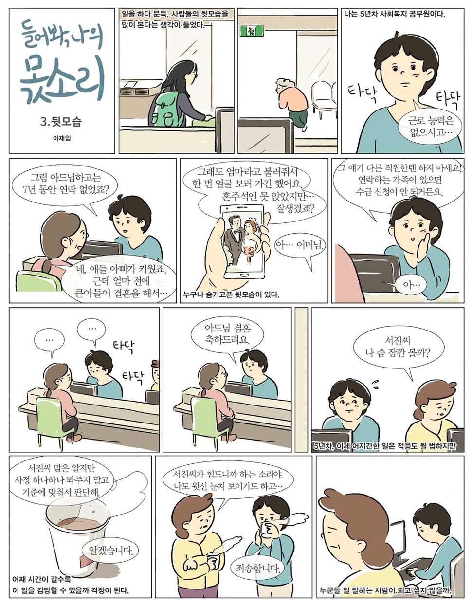 이번호 만화 주인공인 김신우(가명)씨는 서울의 한 자치구에서 10년 넘게 사회복지사로 일하고 있다. 보통 한 분야에서 10년 넘게 일하면 해당 분야의 전문가가 된다고 한다. 그러나 사회복지사 김씨는 이렇게 말한다. “사회복지 현장은 연차와 경험이 쌓일수록 어려워져요. ‘과연 내가 이 일을 잘 감당할 수 있을까’ 걱정과 성찰이 앞섭니다.”