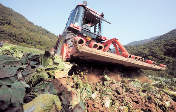 지난 10월15일 오전 전북 무주군 무풍면 현내리에서 한 농민이 자신이 경작한 배추밭을 트랙터로 갈아엎고 있다. 할 수 없이 자식 같은 배추를 스스로 갈아엎는 농민의 마음은 기계 끝에서 갈갈이 찢겨나오는 배추잎과 다름없다.