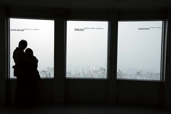 2월11일 오후 서울 남산 서울타워에서 바라본 서울 시내가 안개에 휩싸여 한 치 앞도 내다보기 힘들 정도로 뿌옇다. 전망대 유리창에 붙은 글자는 북한의 신의주가 360여km 떨어져 있다고 알리고 있다. 2월 들어 초봄처럼 따뜻한 날씨가 이어졌고 서울에서는 하루 종일 안개가 걷히지 않는 날들이 계속됐다.