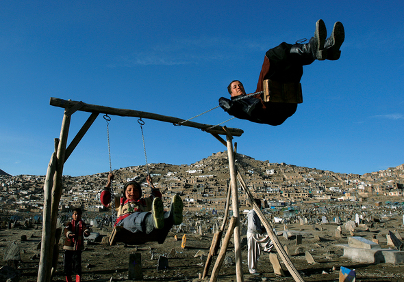 촘촘히 박힌 묘비 사이를 비집고, 누군가 나무를 박아 그네를 맸다. 고단한 삶을 마감한 이들의 외로움을 아이들의 생기 넘치는 웃음소리가 달래주고 있다. 30년 세월 전쟁의 포성이 멈추지 않는 그 땅에도 가끔은 웃음이 있다. 죽음의 흔적이 넘쳐나는 도처마다 아이들이 자라고 있다. 놀고 있다. 눈이 시리도록 퍼런 하늘 높이 꿈을 차올리고 있다. 묘지에서 그네를 타고 있다.