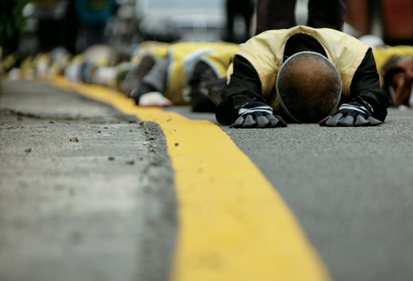 몸을 낮춰 아스팔트 바닥에 엎드리자 매캐한 먼지 냄새가 ‘훅~’ 코를 찔렀다. 당장이라도 비를 뿌릴 듯 잔뜩 찌푸린 하늘은 한낮의 따가운 햇살을 가려줘 오히려 고맙기만 했다. 사람의 길, 생명의 길, 평화의 길을 찾아 3월28일 충남 계룡산을 떠난 지 48일째인 5월15일, 문규현 신부와 수경 스님, 전종훈 신부 등 ‘오체투지 순례단’은 경기 과천시를 지났다. 땅 위에서 엎드렸다 일어섰다를 반복하며 느릿느릿 천천히 앞으로 나아간 이들은 주말 남태령을 넘어 서울에 들어섰다. 6월6일에는 임진각에 도착할 예정이다. 이들의 최종 목적지는 북쪽 묘향산. 길은 아직 막혀 있다.