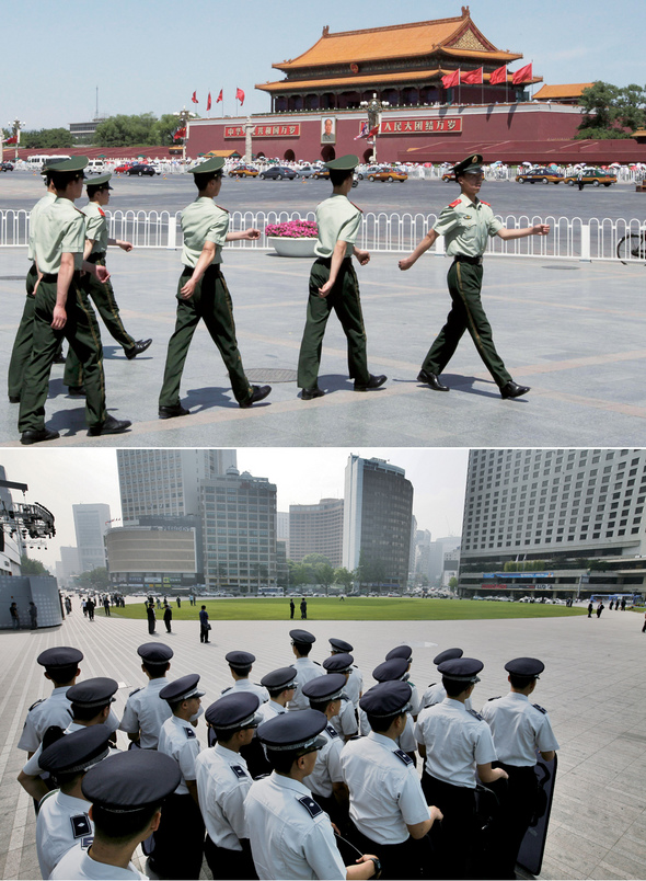 광장은 자유와 소통을 상징한다. 그 주변을 경찰이 배회한다. 어울리지 않는 풍경, 그 메시지는 간결하게 요약된다. 그 땅을 살아가는 민중의 가슴속에 민주주의를 향한 뜨거운 갈망이 일고 있다는 것이다. 국가는 경찰력을 통해 갈망의 분출을 막으려 하지만, 현명한 민중은 되레 그 모습에서 겁먹은 국가의 모습을 발견한다. 톈안먼 사태 20돌을 하루 앞둔 6월3일 낮 베이징시의 톈안먼 광장을 순찰하는 중국 공안의 모습과 4일 낮 서울광장을 지키는 한국 의경들의 모습이 흡사하다. 외신에서 보자면 두 나라의 국가 브랜드는 오십보백보일 듯하다.