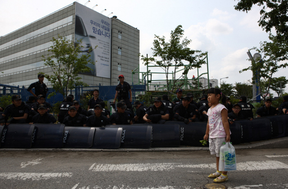 날씨가 오락가락하던 7월1일, 서맹섭 쌍용차 비정규지회 부지회장의 편지를 강호인 대우자동차비정규직지회 부지회장이 대신 읽었다. 서맹섭 부지회장은 50여 일째 ‘굴뚝농성’ 중이다. 그를 포함한 3명의 노동자가 굴뚝 위 농성장에 있다. 이날 전국금속노동조합과 전국보건의료산업노동조합 조합원 3500여 명이 모인 쌍용차 평택공장 정문은 51개 중대 5천여 명의 경찰이 두세 겹으로 에워싸고 있었다.