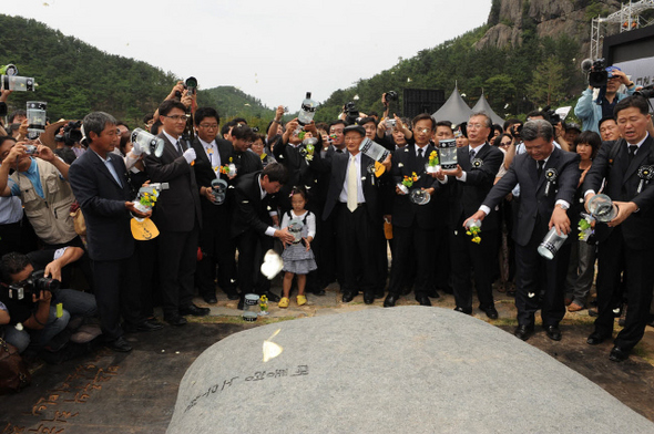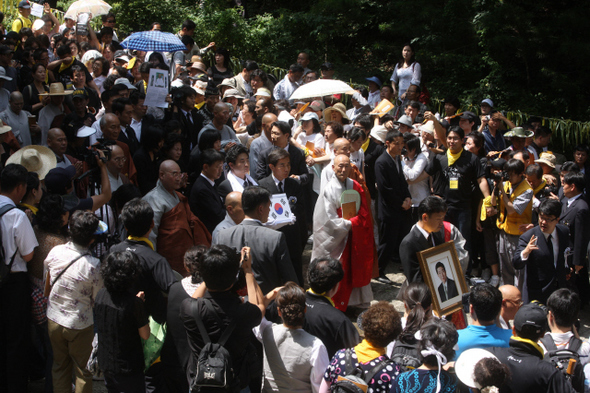 마침내 노무현 전 대통령의 49재가 엄수되었습니다. 지난 7월10일, 하루 전까지만 해도 이 나라 보혁 갈등처럼 줄지어 퍼붓던 비도 숨을 멎네요. 그가 떠납니다, 그가 떠났습니다. 드라마 보듯 멍하게 첫날밤을 맞고, 에염과 회한으로 일주일을 붙들고, 성찰과 다짐으로 또 몇 주를 보내니 어느새 49일이 쌓여 있습니다. 봄꽃 다 지고, 여름꽃 만개합니다. 그는 떠납니다, 그는 떠났습니다. 망자의 49일 동안 결정된다는 내세, 특히 그의 ‘내세’라면 걱정하지 말지요. 아주 멀리 돌아 제 집 앞으로 오듯, 아주 멀리 간대도 그 집 앞일 것을요. 눈부시게 맑은 날 부끄럽지 않은 자들 하늘을 보지요. 그의 죽음을 기억하는 이들의 ‘내일’도 이제 보이려고 합니다.
