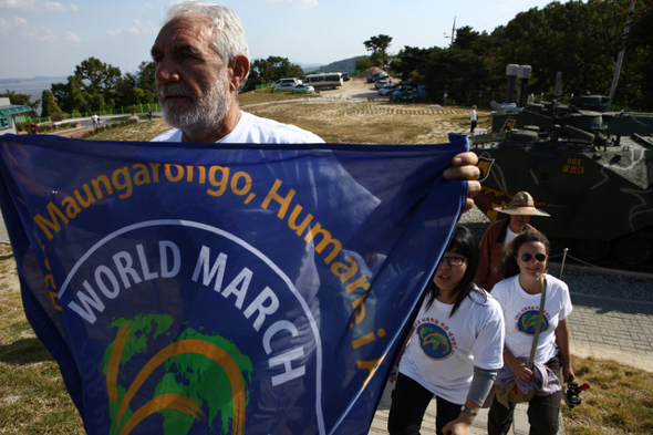 전쟁 없는 세상을 지향하는 ‘평화와 비폭력을 위한 세계행진단’이 지난 10월16일 인천 강화군을 찾았다. 세계 각국의 평화운동가 20명으로 꾸려진 행진단은 이날 강화군 한강 하구 철책선길을 순례한 뒤 강화평화전망대를 찾아 한국 방문 소감을 밝혔다. 라파엘 델 라 루비아(스페인) 단장은 “북한이 지척에 보이는 철책선길을 걸으면서 한반도의 갈등과 분쟁의 역사를 생생하게 느낄 수 있었다”면서 “앞으로 남북한이 통일을 이뤄 한반도에 평화가 정착될 수 있도록 우리도 힘을 보탤 것”이라고 말했다.