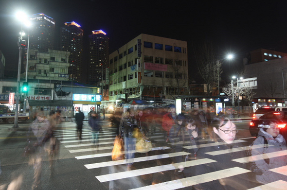 그 사건의 현장, 서울 용산 재개발 4구역 남일당 건물 앞 횡단보도를 시민들이 건너고 있다.