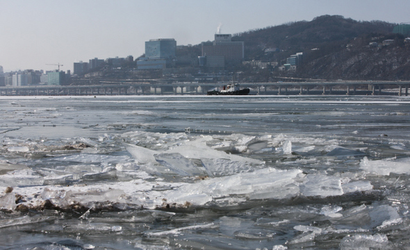 강추위가 매섭다. 2009년 마지막날인 12월31일 서울의 아침 최저 기온이 영하 12.9도를 기록했다. 올겨울 들어 가장 추운 날씨다. 연일 계속되는 추위는 좀처럼 얼지 않던 한강물도 얼려버렸다. 서울 암사동 한강둔치 앞에서 인근 공사장을 오가는 작은 배 한 척이 강 한가운데서 오도 가도 못하고 얼어붙었다. 새해를 맞는 우리 이웃의 가슴은 얼마나 시릴까, 우리 가슴의 온기는 저 조각배를 움직일 수 있을까.