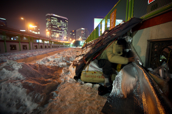 3년째 서울역에서 노숙을 하는 50대 후반의 ㄱ씨는 폭설과 강추위가 맹위를 떨치는 요즘 같은 때면 ‘밤새 안녕’이란 말이 실감난다. 노숙인 쉼터도 만원이라 마땅히 갈 데가 없다. 오늘도 서울역 근처 육교 난간에 얼기설기 엮은 비닐과 종이박스만으로 살을 파고드는 한기를 견딘다. ‘내일 아침에도 다시 눈을 뜰 수 있었으면’ 하는 바람으로 잠자리에 든다. 폭설과 혹한이 겹쳐 닥쳤다. 뉴스는 제설과 교통 대란으로 채워졌다. 고위 공무원은 직접 삽을 들고 눈을 치우는 쇼를 벌인다. 우리가 뉴스가 외면한 어딘가에선, 어느 하룻밤에 사람의 목숨이 달렸다.