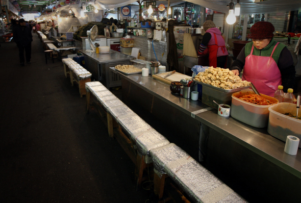서울 종로 5가의 광장시장. 설을 앞두고 북적거려야 할 시장이 썰렁하기만 하다. 다른 상가들도 손님이 계속 줄어들기는 마찬가지다. 호전된 각종 지표의 온기가 차디찬 시장 좌판에까지 전달되기에는 우리 경제 양극화의 간극이 너무나 큰 것은 아닐까?