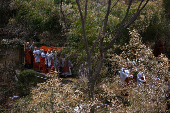 지난 3월11일 78살을 일기로 입적한 법정 스님이 자신이 창건한 서울 성북동 길상사를 떠나던 12일 오전 11시20분, 난데없는 돌풍이 불었다. 스님을 추모하기 위해 모여든 사람들은 “하늘도 스님이 가시는 걸 아나 보다”고 수군거렸다. 법구를 든 스님들이 행지실에서 나오자 길상사를 채운 수천 명은 너나 할 것 없이 “나무아미타불”을 읊조리기 시작했다. 법구가 움직일수록 흐느낌은 점차 높아져 울음소리로 바뀌었다. 법정 스님의 법구는 일체의 장례 의식을 열지 말라는 유지에 따라 스님들과 신자, 조문객이 지켜보는 가운데 간소한 절차로 운구됐다. 길상사와 송광사의 제자들이 스님이 강원도 오두막에서 평소에 사용하던 평상 위에 법구를 모시고 가사를 덮은 뒤 천천히 극락전 앞으로 이운했다. 법구는 극락전 앞마당에서 부처님 앞에 간단한 인사를 올리는 의식 뒤 곧바로 영구차에 실려 스님의 출가 본사인 송광사로 향했다. 지켜보던 신자들과 시민들은 눈물을 흘렸다.