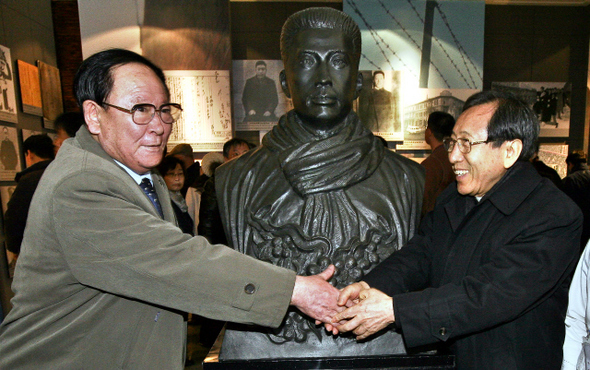 남과 북이 만났다. 모처럼 만이다. 안중근 의사가 다리를 놓았다. 안 의사가 순국한 지 꼭 100년째 되는 지난 3월26일 중국 다롄의 뤼순 감옥에서 추모행사가 열렸다. 가톨릭 신자였던 안 의사의 추모미사가 열리는 가운데 남쪽의 안중근의사기념사업회 함세웅 이사장(오른쪽)과 북쪽의 장재언 조선적십자회 중앙위원장 겸 조선종교인협의회장이 손을 맞잡았다.