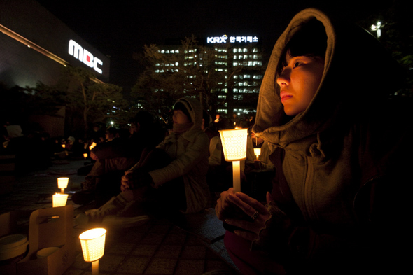 문화방송 본사와 14개 지역사 노조 조합원들이 파업 열흘째인 4월14일 밤 서울 여의도 본사 앞에서 “MBC를 지키자”며 촛불문화제를 열었다. 노조의 반대로 보도본부장에서 물러난 황희만 특임본부장(이사)을 오히려 부사장에 임명해 파업을 촉발한 김재철 사장은 ‘가출한 사장’이라는 비난을 받으면서도 출근도 하지 않는 등 무대응으로 일관하고 있다.