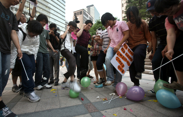 청소년들이 직접 나섰다. 7월9일 오후 서울 청계광장 들머리에서 청소년인권행동 ‘아수나로’ 회원들이 일제고사 반대를 외치며 구호가 적힌 풍선을 터뜨리고 있다.