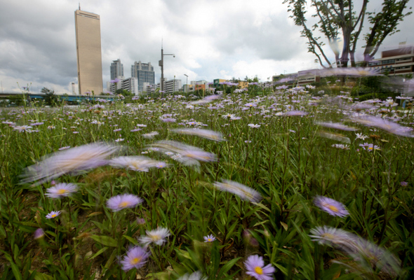 절기는 벌써 가을이다. 입추를 하루 앞둔 8월6일 오후 서울 여의도 한강공원에서 가을의 전령인 벌개미취가 자주색 옷을 갈아입은 채 때마침 불어오는 강바람을 맞으며 무더위에 지친 여린 몸을 식히고 있다. 뜨거운 여름 사이로 살며시 불어오는 가을의 향기가 선뜩선뜩 느껴진다.