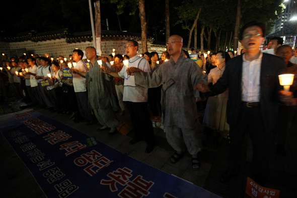8월20일 오후 서울 덕수궁 대한문 앞에서 천주교·개신교·불교·원불교 등 4대 종단의 성직자와 신도 300여 명이 ‘4대강 생명살림을 위한 4대 종단 촛불기도회’를 마치며 손에 손을 잡고 <엄마야 누나야>를 부르고 있다. 4대강 개발 사업을 중단하고 생명·평화를 존중하는 정책을 펴나갈 것을 정부에 촉구하는 이 집회는 10월1일까지 매주 금요일 저녁 8시에 열린다. 몸을 불사르는 소신공양을 하고, 공사 중인 보 위에서 농성을 하고, 이제 도심에선 촛불을 든 기원의 목소리가 모이고 있다. 4대강 사업으로 사람도 자연도 죽이는 결과가 나오지 않기를 바라는 한 가지 마음이다.