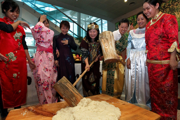 지난 9월10일 오전 서울 성동구청에서 열린 추석맞이 무지개 나눔장터에서 고향의 전통 복장을 입은 다문화가정 주부들이 떡메치기 체험을 하고 있다. 장터에서는 각국 명절 음식 만들기 경연, 인절미 만들기, 송편 빚기, 각국의 전통 의상과 한복 입기 행사 등이 함께 진행됐다. ‘다문화가정 추석 명절 100배 즐기기’라는 이번 행사의 취지대로 올 한가위가 다문화가정 여성들에게도 고향에서처럼 흥겨운 명절이 되기를 기원한다.