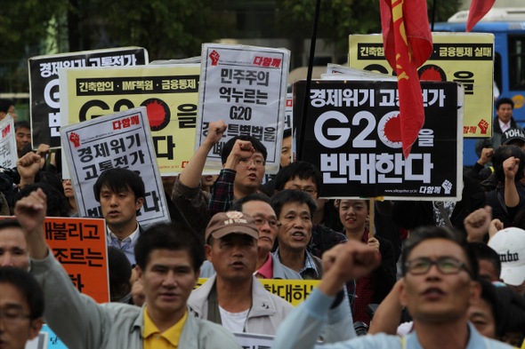 80여 개 노동·시민·사회단체로 구성된 ‘G20 대응 민중행동’ 소속 회원들이 지난 10월1일 오후 서울 종로 보신각에서 열린 ‘민주주의·인권탄압 G20 규탄 국제 공동행동의 날’ 집회에서 “민주주의 억누르는 G20 경호특별법 폐지” 등의 구호를 외쳤다.