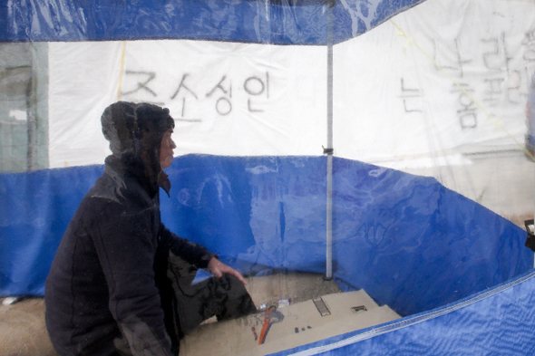 11월5일 오후 서울 성북구 정릉동의 한 아파트 단지 내 상가 2층에서 슈퍼마켓을 운영하는 이우창씨가 같은 건물 1층에 들어설 기업형 슈퍼마켓(SSM)의 공사를 저지하기 위해 건물 입구에 천막을 친 채 보초를 서고 있다. 이씨의 슈퍼마켓이 있는 3층짜리 건물에는 이씨의 가게 외에도 3층에 슈퍼마켓이 하나 더 있으며, 정육점과 빵집, 떡가게, 편의점까지 있다. 이씨는 이미 2년 전 다른 곳에서 슈퍼를 운영하다 대형마트에 밀려 이곳으로 옮겼다.