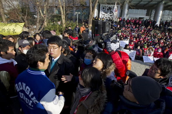 소한 추위가 이름값을 제대로 한 1월6일 오후 서울 상수동 홍익대 문헌관 앞에서 집회가 열렸다. 홍익대와 용역회사가 맺은 계약 해지로 일자리를 잃은 용역직원 140여 명이 고용 승계와 임금 인상을 요구하며 벌인 집회였다. 이들은 그동안 청소와 경비, 시설관리를 해왔다. 비정규직이었다.