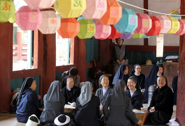 절에 귀한 손님이 들었다. 아기 부처님의 탄신을 축하하려고 김희중 대주교(광주대교구장·천주교 주교회의 교회일치와 종교간대화위원회 위원장)와 함께 지난 5월2일 전북 고창 선운사를 찾은 수녀님들이다. 경내를 돌아본 수녀님들이 연등 아래 앉아 차를 마시며 이야기를 나눈다. 밝고 편안한 표정들이다.