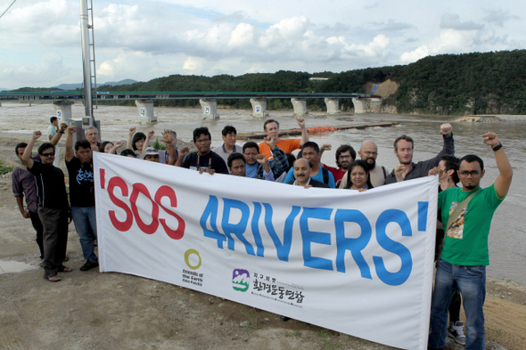헤만디와 로하스 등 ‘지구의 벗’(Friend of Earth) 활동가들이 지난 6월30일 오후 4대강사업 현장 중 한 곳인 경기도 여주군 강천보를 찾아 “4대강을 살려달라”(SOS 4RIVERS)는 펼침막을 펼쳐들고 “노 댐!”(NO Dam!)을 외치고 있다. 이들 뒤로 침수 피해를 막으려고 설치한 가물막이의 일부가 불어난 물살을 이기지 못하고 휩쓸려간 강천보 공사 현장이 보인다.